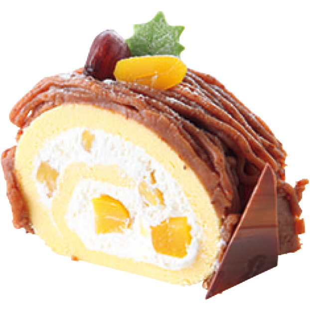 なめらかなスポンジに甘さひかえめのホイップクリームと栗の甘露煮を巻き込みトッピングに和栗のマロンクリームで全体を覆い森をイメージとした飾りつけとしました。