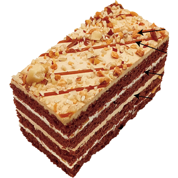 ココアスポンジに香ばしいプラリネ入りホワイトクリームとクリーミーなキャラメルクリームをサンドしました。仕上げにビターなキャラメルソースを掛けて香ばしい3種のミックスナッツを振りかけました。