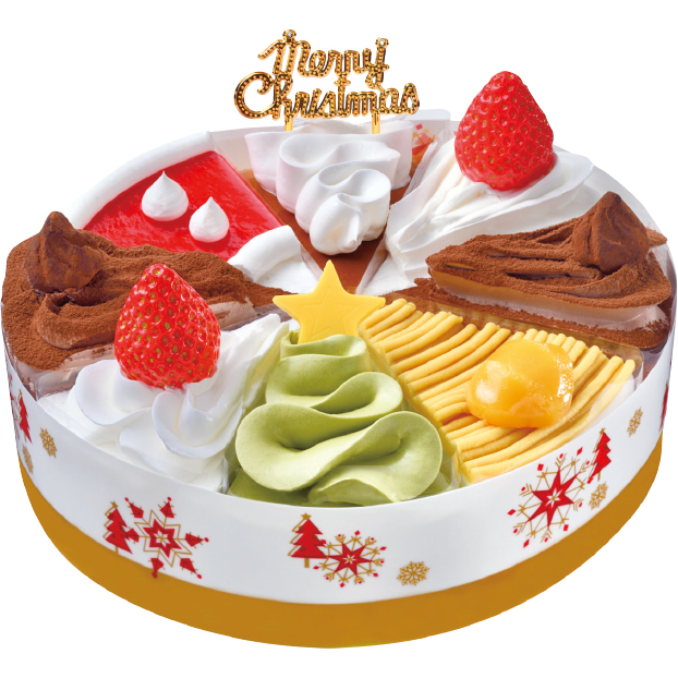6種類の味が楽しめるパーティーにぴったりのクリスマスケーキです。(苺ショート2個、チョコケーキ2個、マロンケーキ1個、チーズスフレ1個、ストロベリーとラズベリーのケーキ1個、抹茶のケーキ1個)苺別添2個