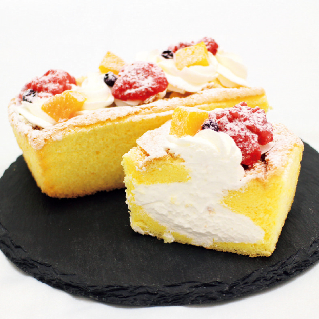 ふんわり軽いパウンドケーキに生クリームブレンドのホイップクリームをたっぷりと絞り、3種のフルーツ(ストロベリー・ブルーベリー・黄桃)で飾りました。